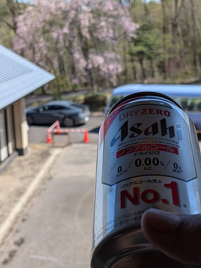 フロ上がりに桜花を眺めながら、ノンアルコールビールで水分補給です。