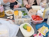 桜の枝の真下にテーブルを展開して、母の作ったかやくご飯おにぎり、卵焼きにおひたしに加え、我々夫婦で購入したファミチキ、焼き鳥、そしてスイーツを広げてお昼御飯です。