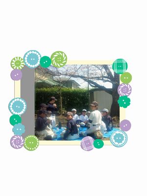 咲き始めた桜の下でみんな仲良くお昼を食べています