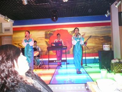 この写真を見て気がついた貴方はスルドイ!そうです、ここは北朝鮮国営の北朝鮮料理の店なのです。毎日夜の7時半からショウがあるので、私は嫌だイヤダとは言いましたが記念にパチリと記念撮影。下の写真は胸元のアップです。前総書記のバッチがキラリと輝いていました。