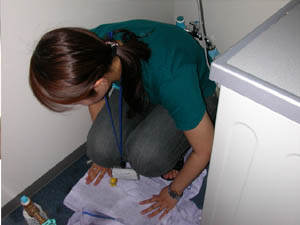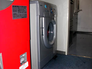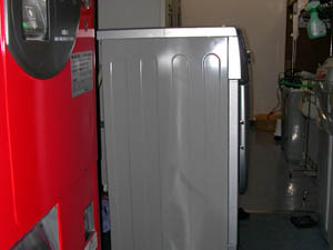 ←のように自動販売機の隣にスッポリ収まっているはずの洗濯機が、ナント通路を塞いで通せんぼをしているではありませんか!!おまけに周りを水浸しにして・・