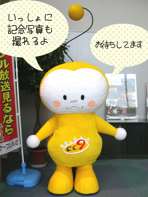 本日よりケーブルテレビの受付にニューフェイスが加わりました。CC9イメージキャラクター『きゅ〜ちゃん』ですっ!等身大でかなりの存在感。これまで番組ではご挨拶をさせていただいていますが、今後は毎日、ケーブルテレビのエントランスでお客様をお迎えします。