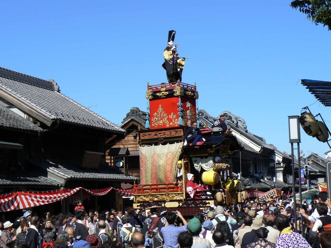 私は初めて川越の山車を拝見しました。構造は二層の鉾と人形からなる江戸型ですが、台座から上の部分が回転する回り舞台が特徴で、お囃子を周囲360度の観衆に披露することができます。上層に出る部分と人形は迫り上げ式エレベーターになっており、山車の胴部分から人形が迫り上がってくる様子を間近に見ることができます。 メインストリートの電線は栃木と同じく地中化されており山車の巡行には最高の舞台です。巡行を妨げないよう、交差点の信号が折りたたみ式になっていたり、道路標識の裏面は町並みと同化するよう黒塗りを施すなど、細部にわたりまつりのための町並み整備が行われている点にも驚きました。