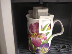 それもこれも、全てはおばさん特有の「もったいない精神」によるところ。 裏面の「おいしい飲み方」を呼んでみると、「2,3回に分けてお湯を注ぐ(一杯分140ml)」と 記されているのですが、私のマグカップに140mlじゃ、いいとこ半分!! ついつい、どうせ 作るんだからもうちょっと・・とお湯を入れ過ぎ、必ず薄くなってしまうのです。一度なんか、 薄過ぎてインスタントコーヒーを足したくらい。 我ながら情けなかった・・ そこで意を決して(ちょっと大袈裟?)書いてある通りに作ってみたら、やっぱり美味しかった!!