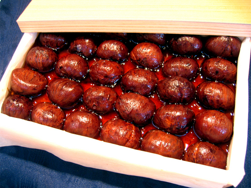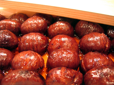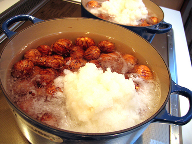 材料:栗1kgだと→水・大根おろし茶碗一杯・重曹小さじ1程度・砂糖400〜500g程・醤油とラム酒(ブランデーでも)少々