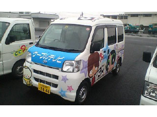 ケーブルテレビイメージキャラクター「きゅーちゃん」と、アニメキャラクターが車体を覆うラッピングカー。