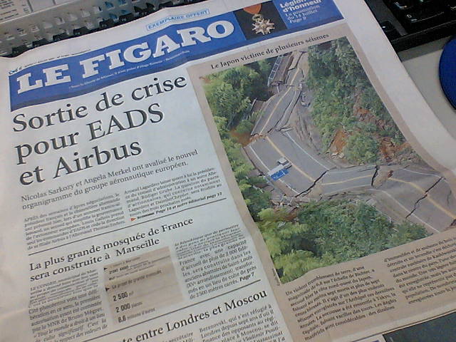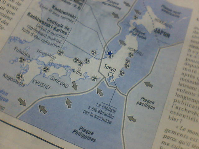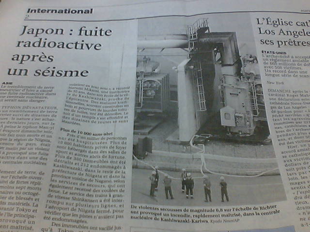 家族や知人の安否も確認できたので、私は地震翌日はフランスへ渡航したのですが、フランスの新聞も日本の地震のニュースを一面トップで伝えています。国道8号線の崩落の写真に続き、二面では柏崎刈羽原発の状況を詳細に綴っています。放射能漏れの危険性は海外においても大きな関心事で、柏崎以外の日本の原発の位置についても触れています。