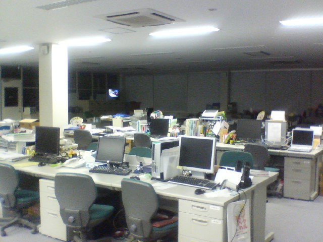 夜のオフィスは怖いですね。