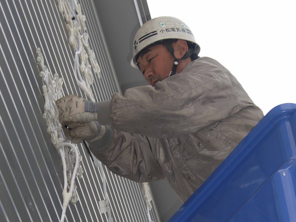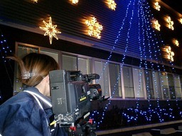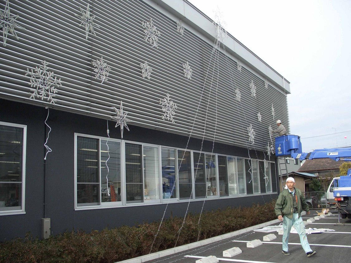 そんな中、我がケーブルテレビでもイルミネーションの設置工事が昨日から始まりました。社屋壁面全体を使用するため、作業にはケーブルテレビの工事で使用するバケット車(高所作業車)が大活躍!日頃お世話になってる電気屋さんも大活躍!!(小松電気さんありがとうございますっ)。作業は急ピッチで進み、イルミネーションの点灯テストをすることに。プロデュースした阿久津女史も緊張の面持ちです。