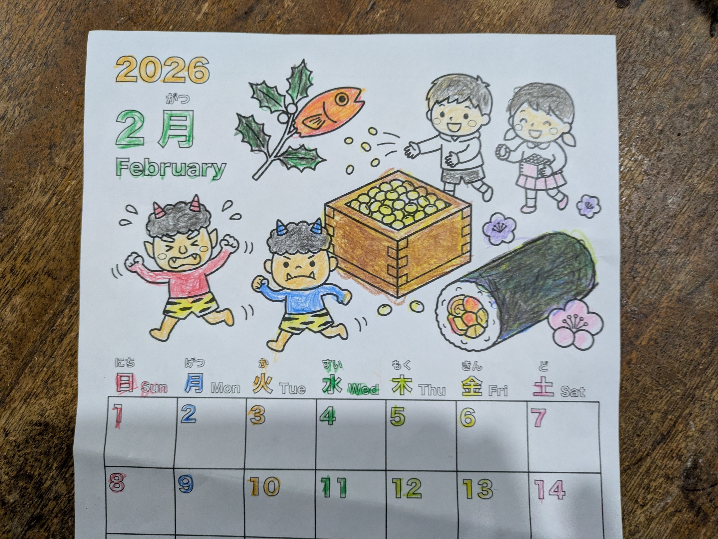二月カレンダーの塗り絵を