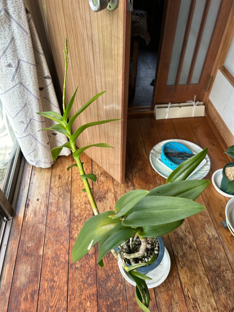 洗濯物を干しながら 庭のラン鉢に目をやると 出てる!!!