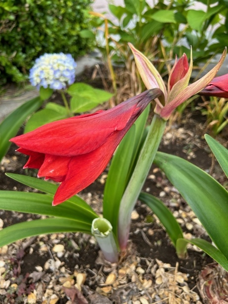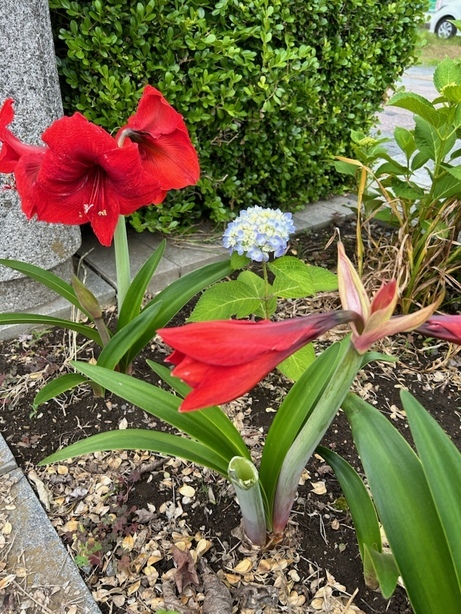 途中、歩道脇の花壇に真っ赤な花が咲いてました。