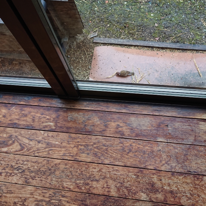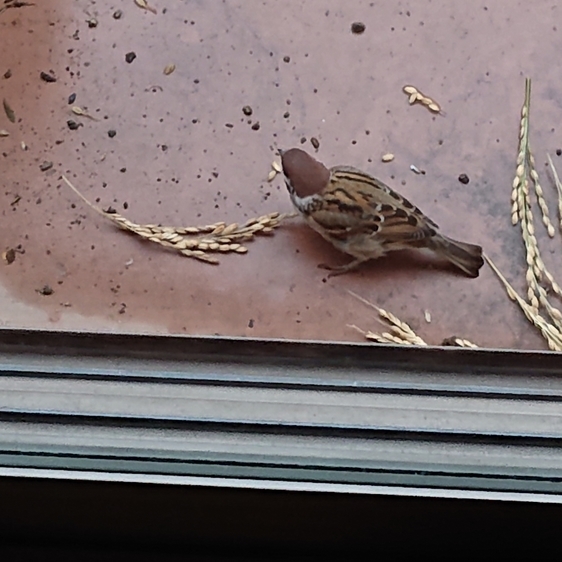 寒いから、もうカーテン閉めちゃうかなと廊下に出たらすずめが食事中。