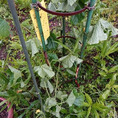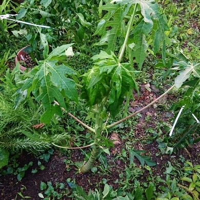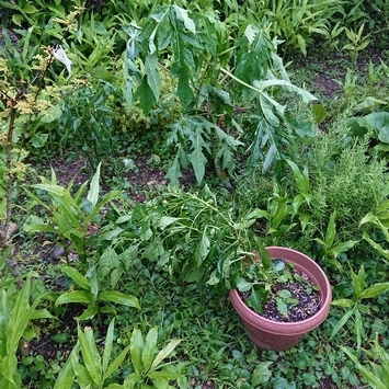 唐辛子、ピーマンが倒れ キュウリとパパイアの葉っぱが折れてる。