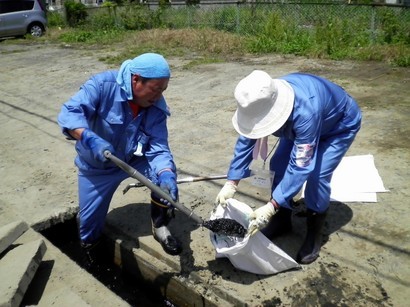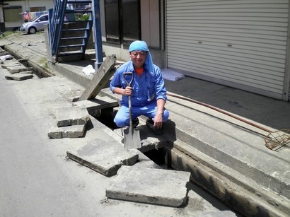 みなさん、こんにちは。午後の雨で涼しくなるかと思えば、蒸し暑くて(笑)昨日は宮城県石巻市に栃木市議員団で災害ボランティアに行ってまいりました。バスで夜中の2時に佐野を出発し、活動場所の石巻市に着いたのが8時半ごろ。すぐさま仕度をして振り分けられた現場に向かいました。今日の作業は側溝の汚泥の掃除。広瀬は今回で3回目の被災地ボランティアでしたが、側溝の掃除は初めてでしたね。道具はスコップとバール。側溝のフタがなかなか開かずに苦労しました。汚泥も底から20cmくらい沈殿しており、土嚢袋に入れて片付けるのですが、30度を超える炎天下の下汗だくでおこないました。他の参加者と混成の9名のグループでノルマは約200mほど。男性陣6名、女性陣3名。男性が交代で側溝のコンクリートのフタをこじあけ、スコップで汚泥を袋に入れ、女性陣が袋を縛って3mほど運ぶの繰り返しです。適時休憩をしながらの作業でしたが、流れる汗は滝のよう(笑)画像で広瀬と写っているのは大川議長です。まさか先輩の女性より先に音をあげられませんので結構マジに働きましたよ