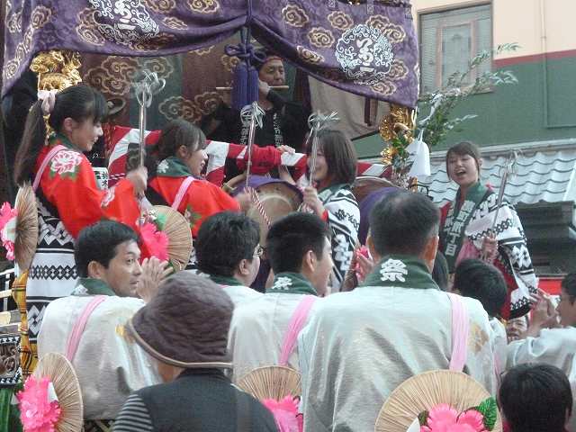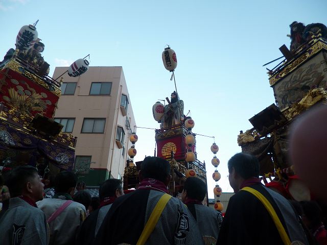 日が暮れて夜の部になりますと、提灯の明かりやライトに照らしだされた山車の見事さが一層引き立たされて帰るのが惜しく思われますね・・・。