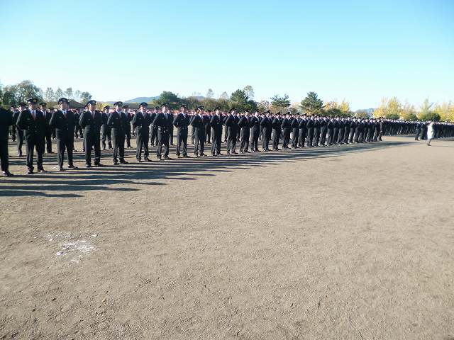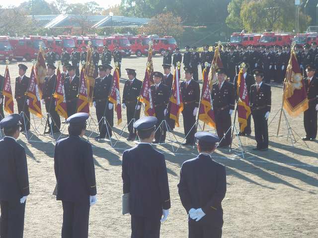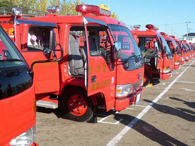 1050名の団員とずらりと並ぶ消防ポンプ車。規律正しく微動だにしないままの姿勢。颯爽とした制服姿。 実は広瀬も消防団に6年間ほどお世話になっておりました。 消防団は毎年1回「ポンプ車操法大会」がありまして、なにかといえば、消防ポンプ車からホースをつなぎ、消火をして、器具やホースを収納するまでを競技としておこなうものですが、各部から5人がチームとして出場しまして、指揮者、1番員、2番員、3番員、4番員と役割が決まっております。各番員の個人賞と総合優勝がありますが、広瀬も3回操法大会に出場しまして、個人賞を3つ持っております(^−^) はっきり言って自慢です!(笑) けっこうすごいことなんですよ?