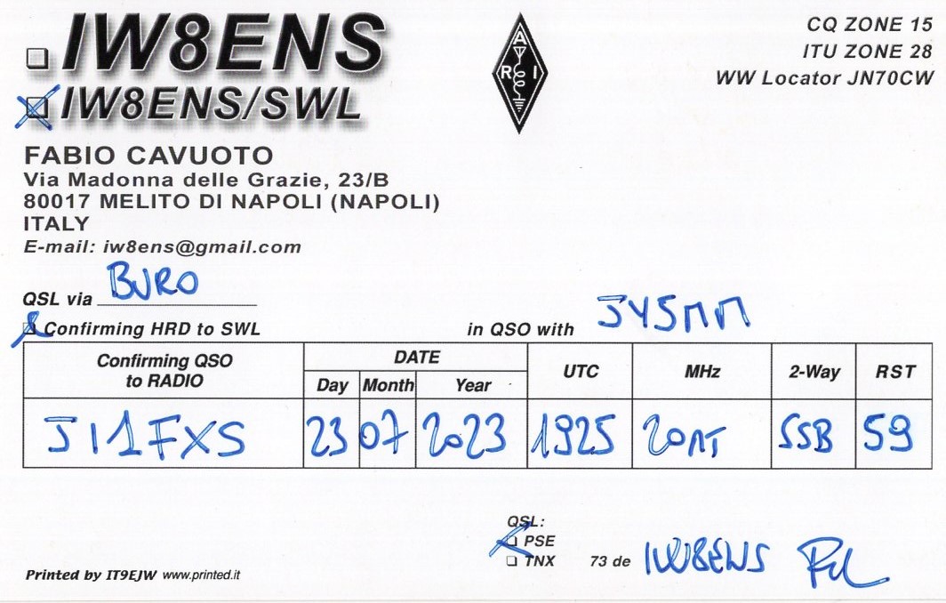 IW8ENS/SWL(Italy) 23July2023に14MhzSSBでQSOの受信 WKD JY5MM PSE QSLで到着。 最近、殆んど来なくなったSWLカード(受信証 放送局に送ればくれるベリーカードのようなものの逆でアマチュア局も受信証明カード発行します。)