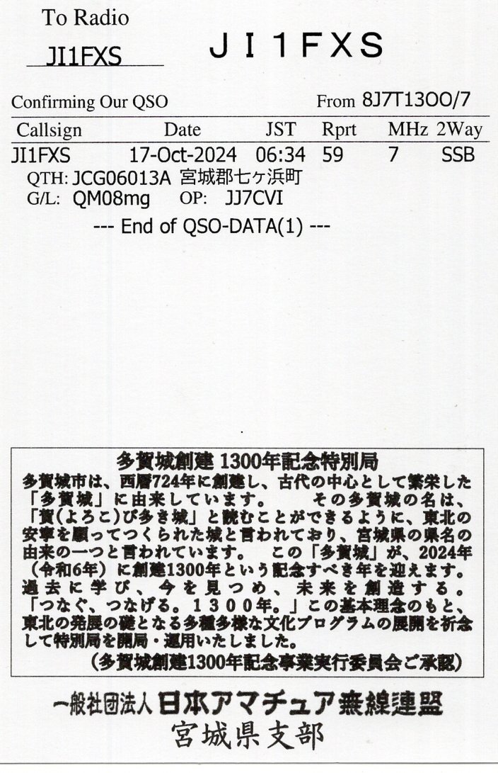 8J7T13OO(多賀城創建1300年記念特別局) 17Oct2024に7MhzSSBでQSO。 運用地:宮城県宮城郡七ヶ浜町 OP. JJ7CVI