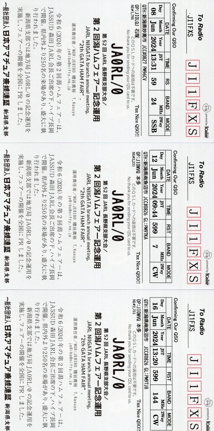 JA0RL/0(第2回潟ハムフェアー記念運用) 01June2024に7MhzSSBでQSO。 運用地:新潟県糸魚川市 OP. JA0PYA 上村OM 07June2024に7MhzCWでQSO。 運用地:新潟県刈羽郡刈羽村 OP. JE0KBP 井澤OM 08June2024に50MhzSSBでQSO。 運用地:新潟県妙高市 OP. JI0LQJ 石塚OM 08June2024に24MhzSSBでQSO。 運用地:新潟県妙高市 OP. JI0LQJ 石塚OM 12June2024に7MhzCWでQSO。 運用地:新潟県南魚沼市 OP. JI0WVQ 本多OM 16June2024に144MhzCWでQSO。 運用地:新潟県南魚沼市 OP. JI0WVQ 本多OM 次回からは、12月JARL Buroより到着カードDX局編をUP致します。