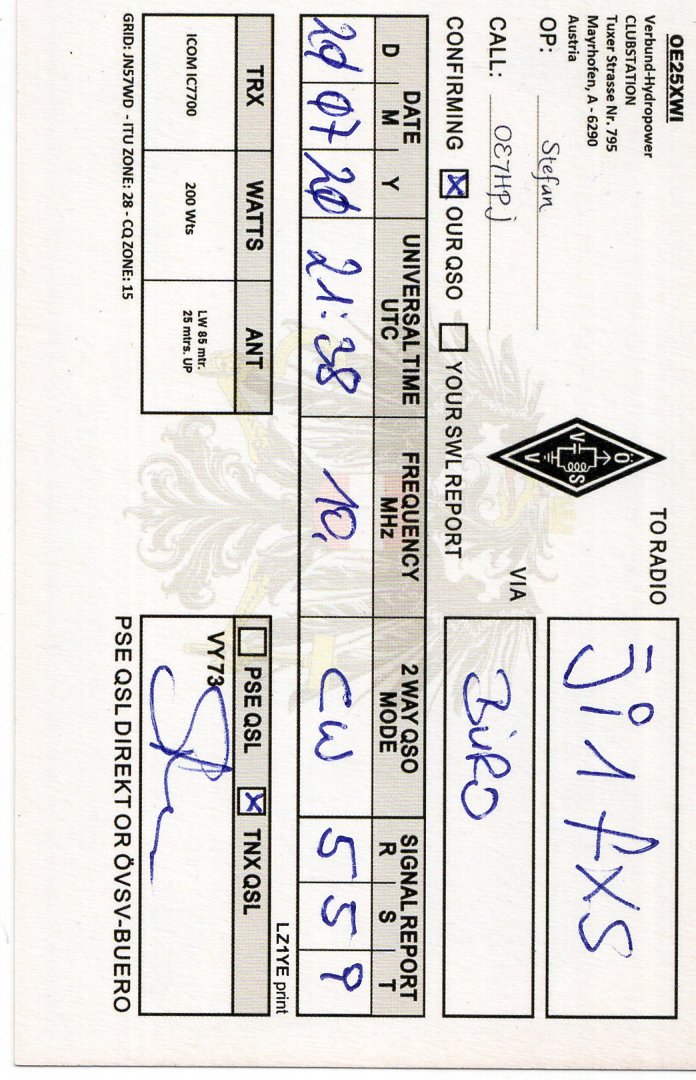 OE25XWI(Austria) 20July2020に10MhzCWでQSO。 OE25XWI局宛にBuroへ発送 TNX QSLで到着。