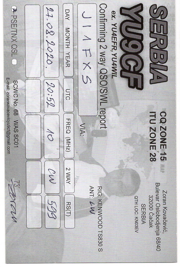 YU9CF(Serbia) 27Aug2020に10MhzCWでQSO。 PSE QSLで到着。