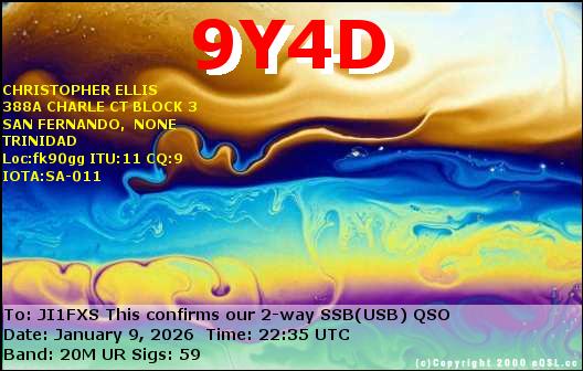 9Y4D(Trinidad & Tobago) 09Jan2026に14MhzSSBでQSO。 QSL:eQSL CAG, LoTW, Direct IF Needed Paper QSL