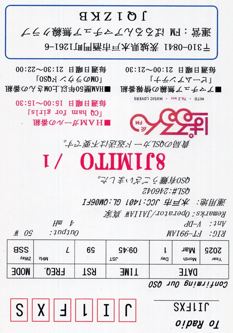 8J1MITO(水戸のまつり記念局「梅祭り」 01Mar2025に7MhzSSBでQSO。 運用地:茨城県水戸市 OP. JA1IAW 真家OM