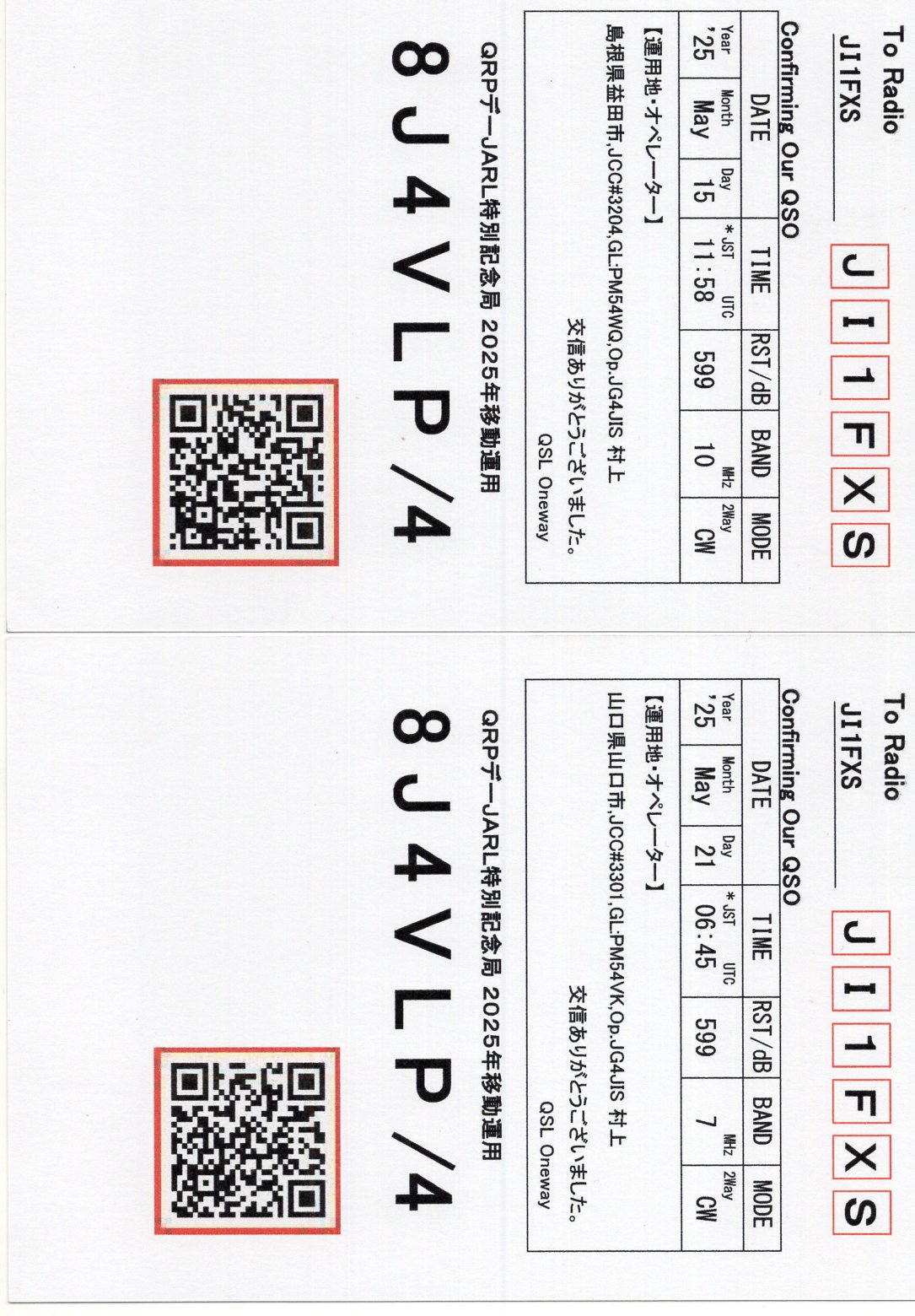 8J4VLP(QRP デー特別記念局) 15May2025に10MhzCW 運用地:島根県益田市 OP. JG4JIS 村上OM 21May2025に7MhzCW 運用地:山口県山口市 OP. JG4JIS 村上OM