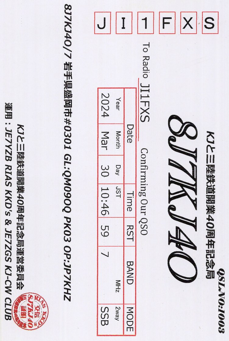 8J7KJ4O(KJと三陸鉄道開業40周年記念局) 30Mar2024に7MhzSSBでQSO。 運用地:岩手県盛岡市 OP. JP7KHZ