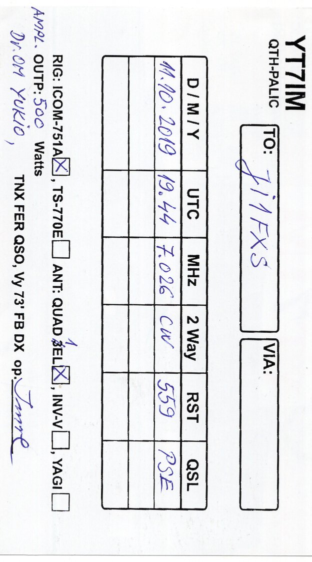 YT7IM(Serbia) 11Oct2019に7MhzCWでQSO。 QSL PSEで到着。 2020年1月にBuroへ発送済です。