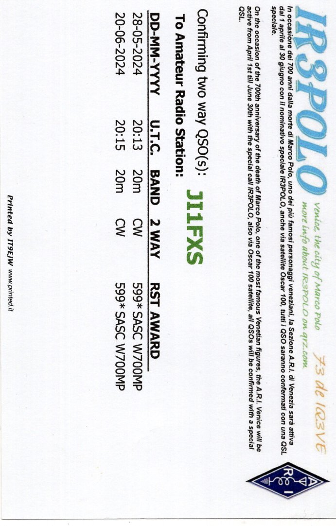 IR3POLO(Italy) 700° Anniversary of death 28May2024に14MhzCW 20June2024に14MhzCWでQSO。