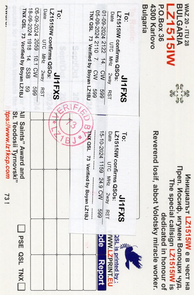 LZ1515IW(Bulgaria) 01Sep2024に14MhzCW 06Sep2024に7MhzCW 06Sep2024に10MhzCW 15Sep2024に24MhzCW 18Sep2024に14MhzSSBでQSO。 QSL Via LZ1KCP TNX QSLで到着。
