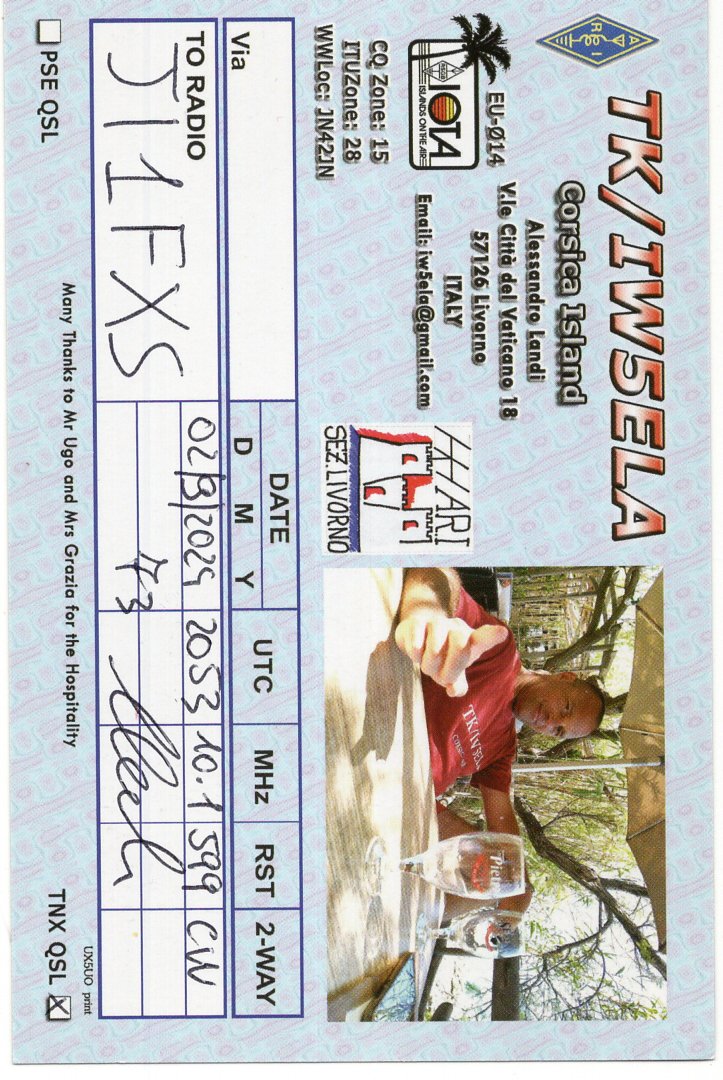 TK/IW5ELA(Corsica Island IOTA EU014) 02Sep2024に10MhzCWでQSO。 QSL Via IW5ELA TNX QSLで到着。
