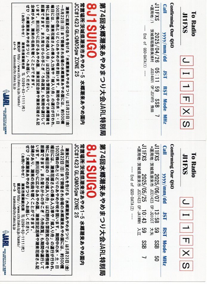 8J1SUIGO(第74回水郷潮来あやめまつり大会JARL特別局) 26Apr2025に7MhzSSB 運用地:茨城県稲敷郡美浦村 OP. JS1VFO 飛田OM 25May2025に7MhzSSB 運用地:茨城県潮来市 OP. JA1WWH 入江OM 07June2025に50MhzSSB 運用地:茨城県潮来市 OP. JQ1CCT 大矢OM
