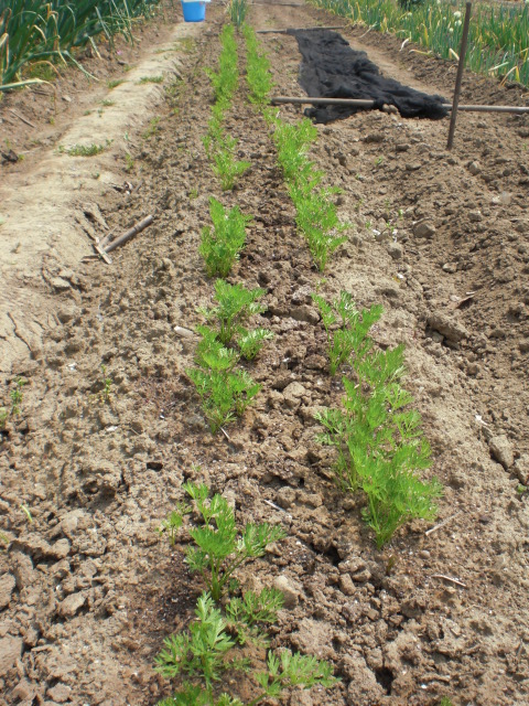 三月下旬に蒔いた人参もやっとここまでになったがこちらにも水をやらねば・・・