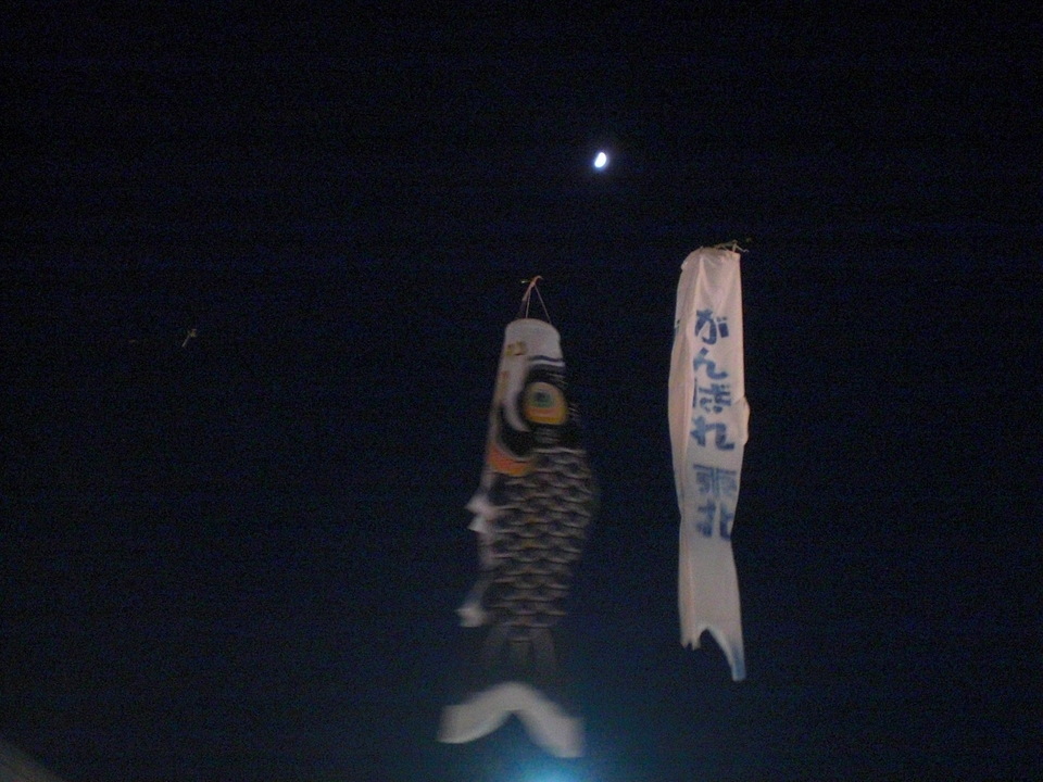 各店から発する美味しそうな焼き物の煙とにおいが、会場いっぱいに充満し、そのまま天高く昇って夜空で泳ぐ鯉や、煌煌と輝く半月の月まで届くような勢いだ