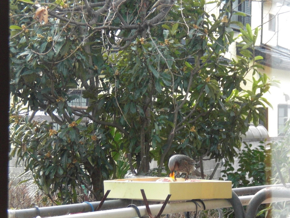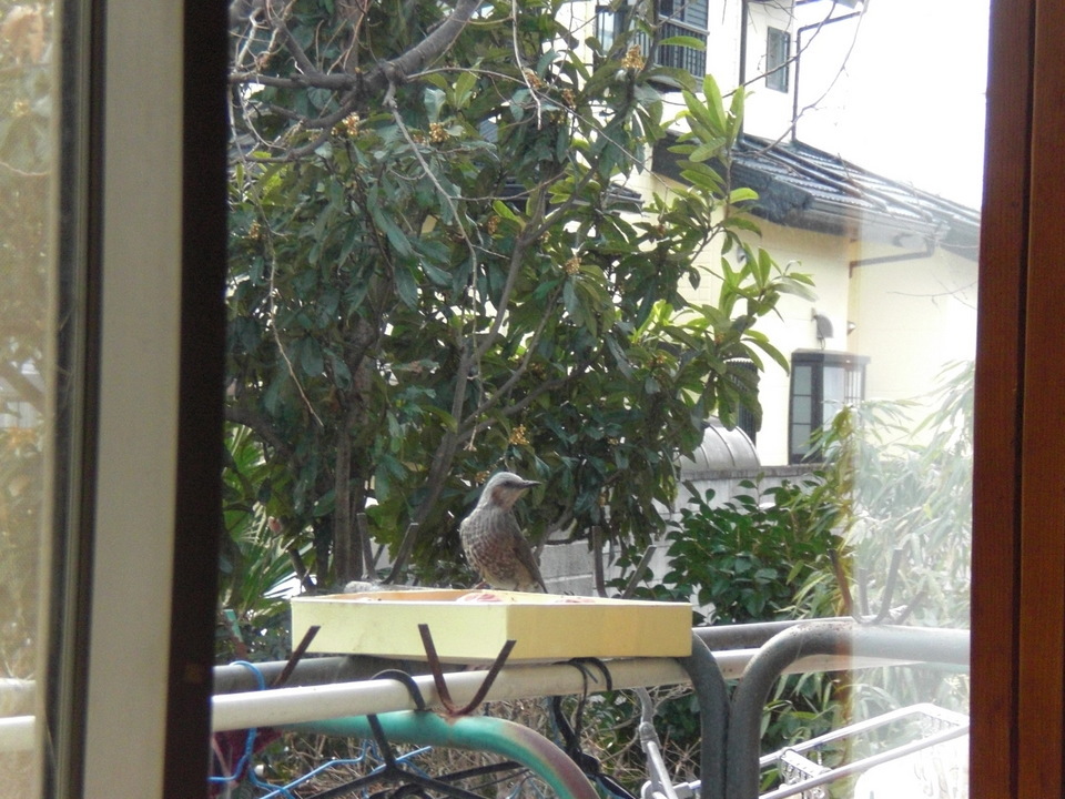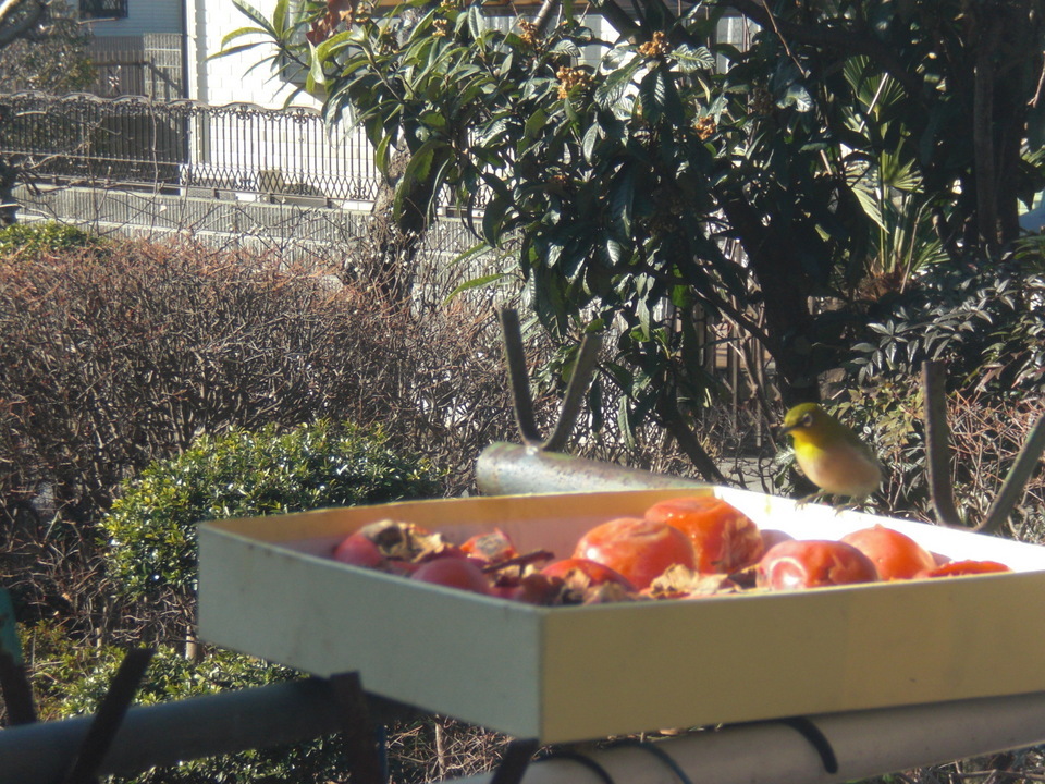 昨日、軒先の物干し台の上に、箱の中に熟し柿を10個ほど入れておいたら、ヒヨドリとメジロが朝から夕方まで交互に食べにきてる、小さな割にはどん欲に食べてる様は厳しい冬の食糧事情なのだろうか?