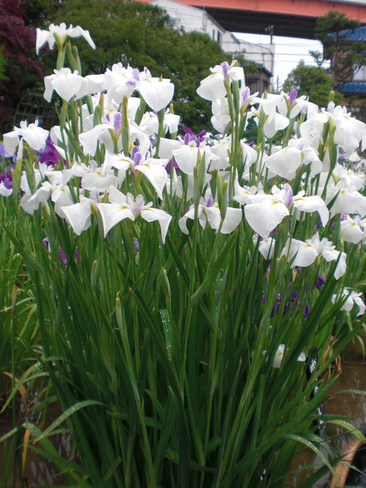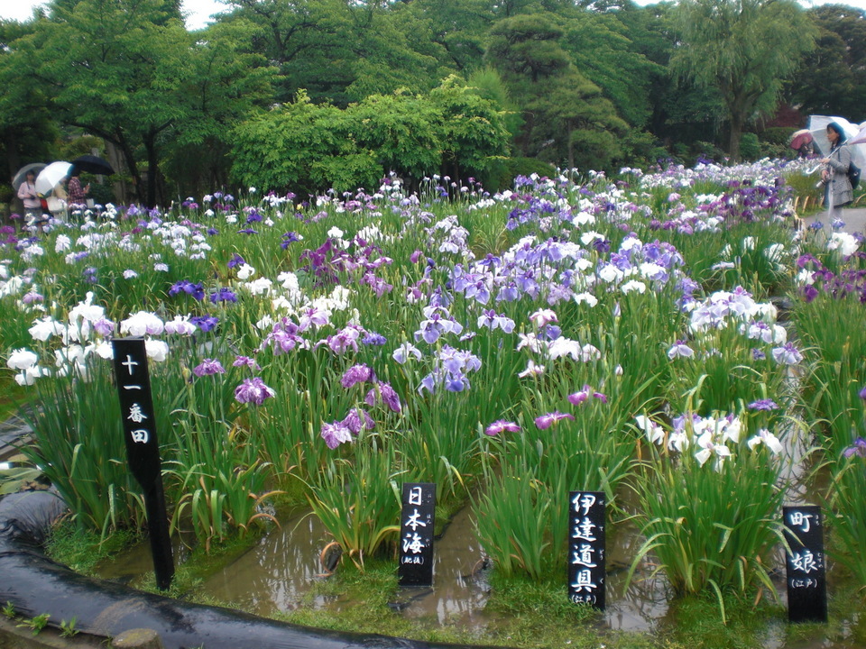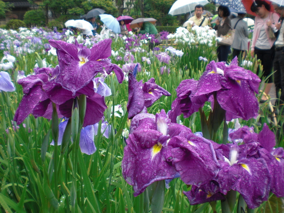 これ見よとばかりに今咲き誇る堀切菖蒲園に小雨降る中行ってきた、さほど広くはないが区立の菖蒲園とあって手入れが行き届いていて整備されている、東京スカイツリーの観光コースの一部なのか団体のバスツアーがやってきて園内は菖蒲の花のほかに雨傘の花も咲き乱れていた。
