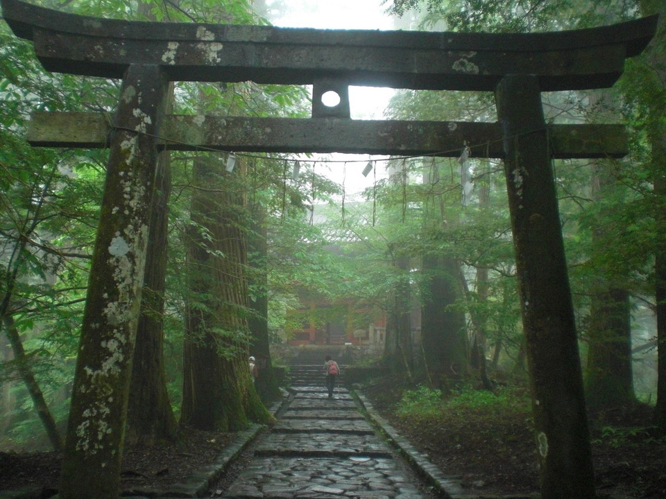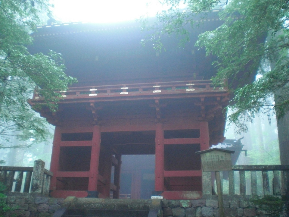 いつ降り出してもおかしくない空模様、視界は100bもない、昼なお暗い史跡道を稲荷川に沿って登る、途中、日光開山の祖、勝道上人のお墓、や家康公の愛馬の墓、弘法大師修業の場の白糸の滝、そして最後に瀧尾神社、弘法大師が修行した時に田心姫が現れた場所の三本杉(今は二代目の杉)へたどり着く、此処はあまり訪れる人もなく静かで、時の流れを気にせず、ユックリト拝観できるのがいいね〜(*^_^*)。