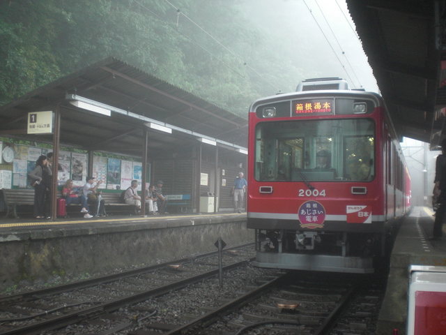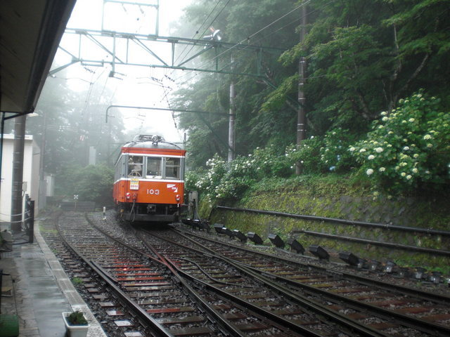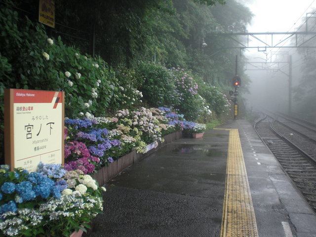大勢の旅人を乗せて「あじさい電車」が静かに宮の下駅の花々に歓迎されやってきた。