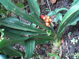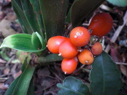 庭を掃除していたら、サツキ、の下で万年青が真っ赤な実をつけ存在感を表していた。