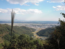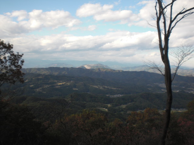 グミの木峠辺りは杉の木の間伐がいきとどかず痩せこけた杉が密集している、ゴツゴツした岩いしの道を行くとブドウ団地を見下ろす場所に出る、大平町や筑波山方面がよく見える。
