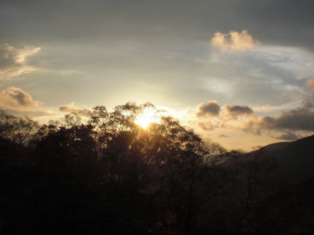 煙草屋の露天風呂より沈みゆく夕陽を見ている内に辺りは瞬く間に真っ暗となる、夜、野天風呂に行くときは必ず懐中電灯を持参しないと足元が危ない。