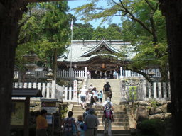 男体山頂上(871m)へさらに登って神社に参拝、後、重い足を引きずるように、今度は女体山(877m)へ登山、頂上よりさっき登った男体山をふりかえり見る。(絶景かな絶景かな)