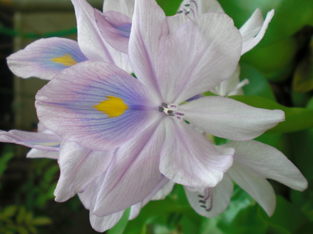 庭の水桶にあるホテイアオイが次々と花を咲かせています・
