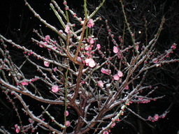 マイブログ『梅一輪』(1/11記)のあの紅梅も、あれからこんなに咲いたところにこの真っ白な雪でいっそう綺麗になった。