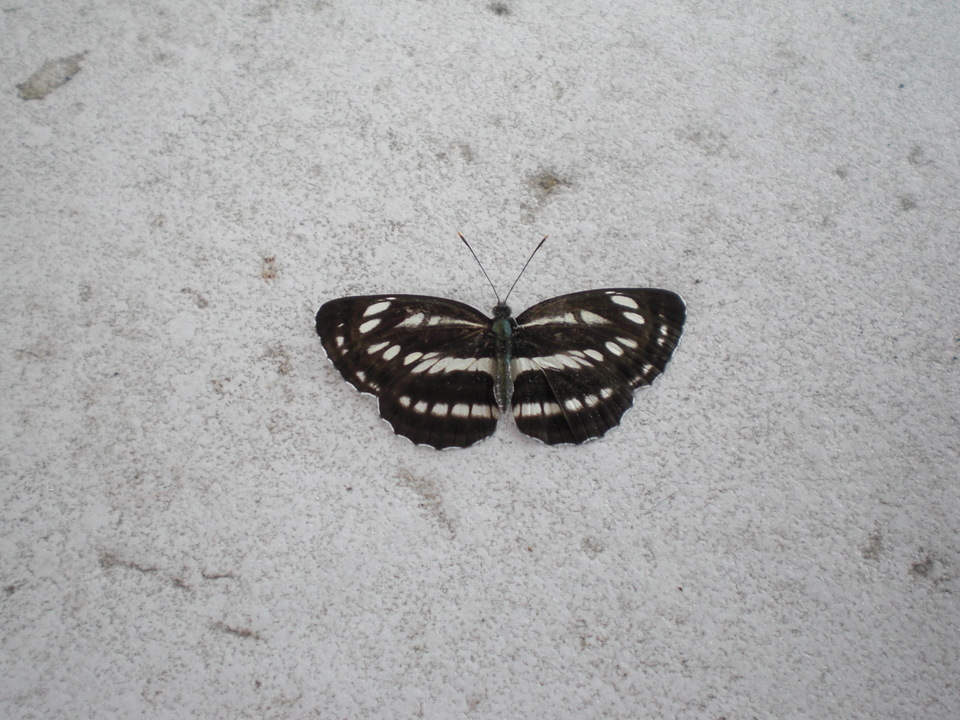 ちょっとおもしろい模様の蝶が駅のホームのタイル上で弱々しくわずかに羽が動いていた
