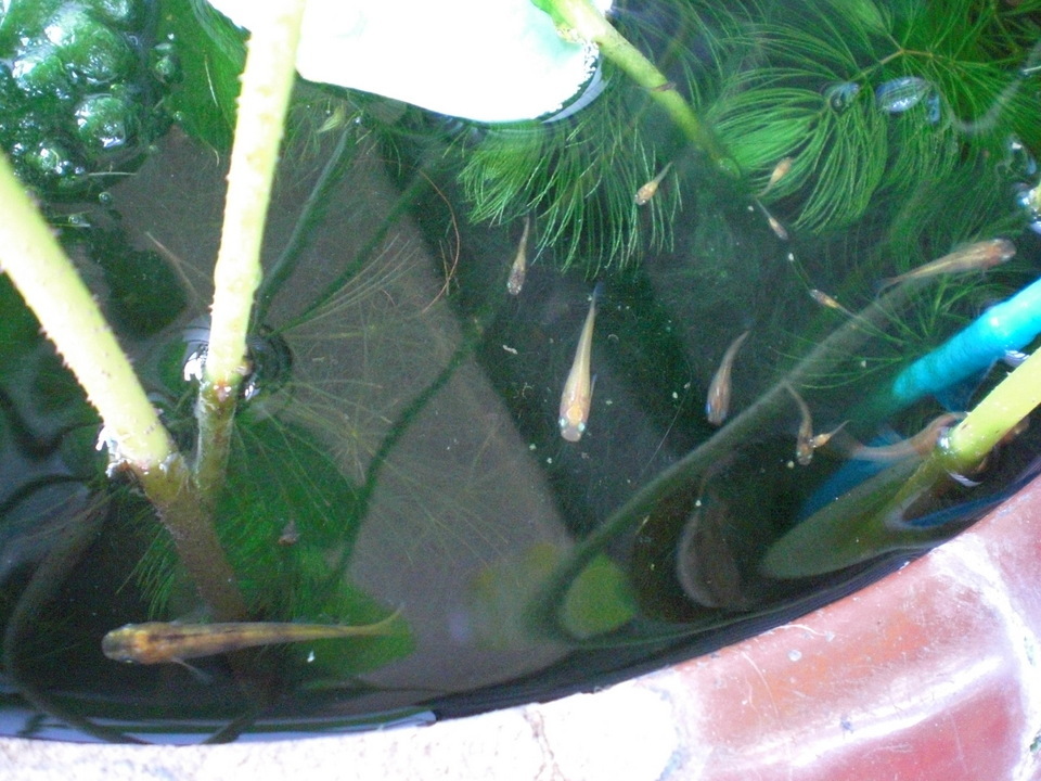 メダカの赤ちゃんが大分大きくなってスイスイ、チョロチョロと元気に泳ぎ回っているが、この頃赤メダカと白メダカの姿が見えないが、どうしたのだろう!?