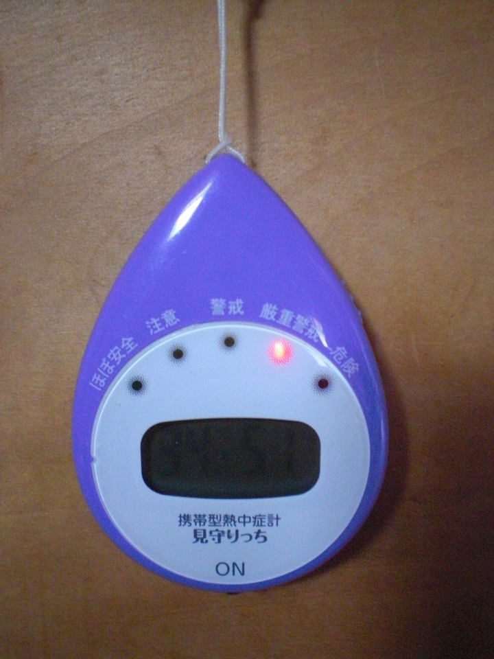 わが家では子供が「携帯型熱中症計見守りっち」を数年前にプレゼントしてくれたのでこのデジタルテクノ!?・・・によって10分おきに危険度をアラーム(温度、湿度も)で知らせてくれるから有難いです